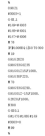 为避免在调用刀库过程中出现调用混乱,同时绝对式飞碟刀库退刀采用机械式退刀,退刀偏心挤压行程大约在 10 mm 左右,退刀速度分为两种,挤压退刀时采用低速,以免过大的机械冲击造成设备的损坏,其换刀宏程序程序如下: